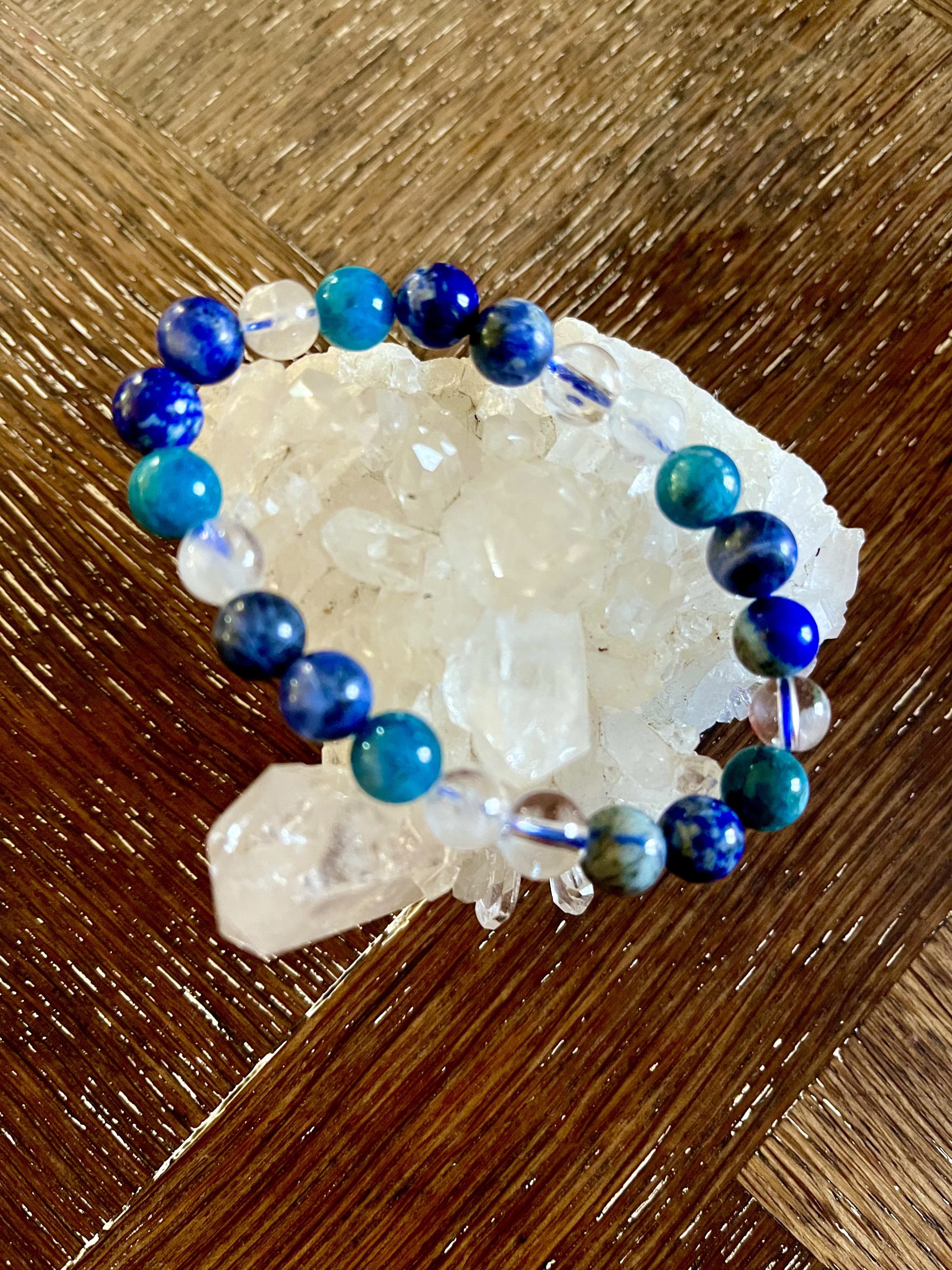 Dans ses nuances de bleu profond, ce bracelet évoque la sagesse des anciens. Le lapis-lazuli, la sodalite et l’apatite bleue tissent une harmonie élégante qui va bien au-delà de l’ornement. Ce bijou devient un talisman raffiné, révélant la clarté de l’esprit et la fluidité de la parole, comme une lumière intérieure qui s’élève à chaque port.