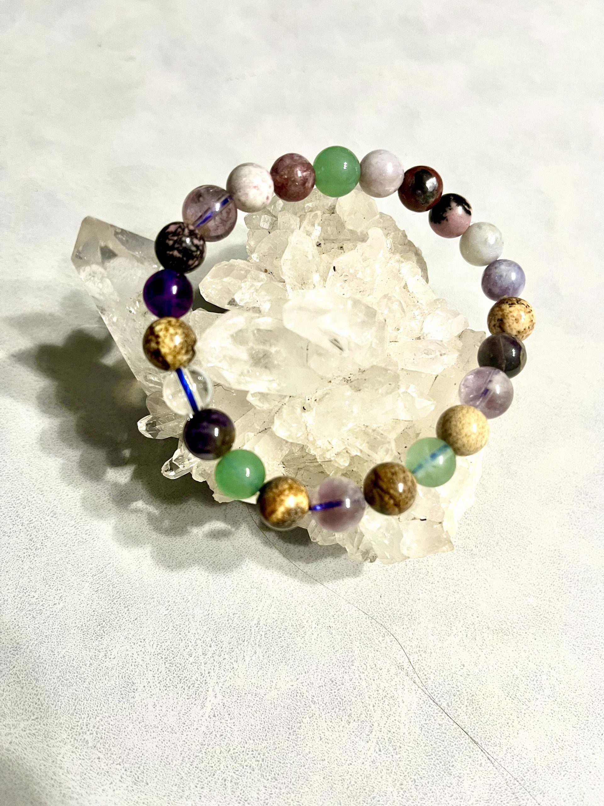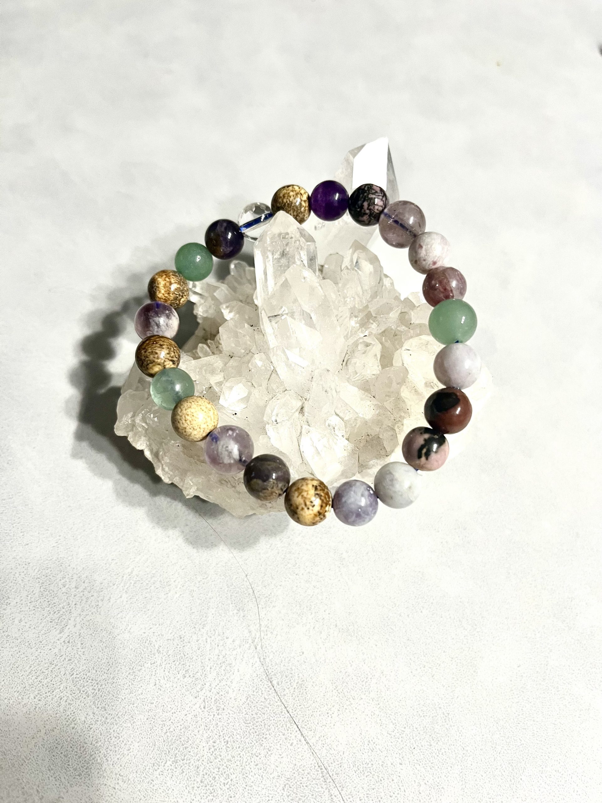 Perles : Rhodonite, Quartz rose, Améthyste, Tourmaline rose/Eudialyte, Jaspe paysage, Aventurine verte
