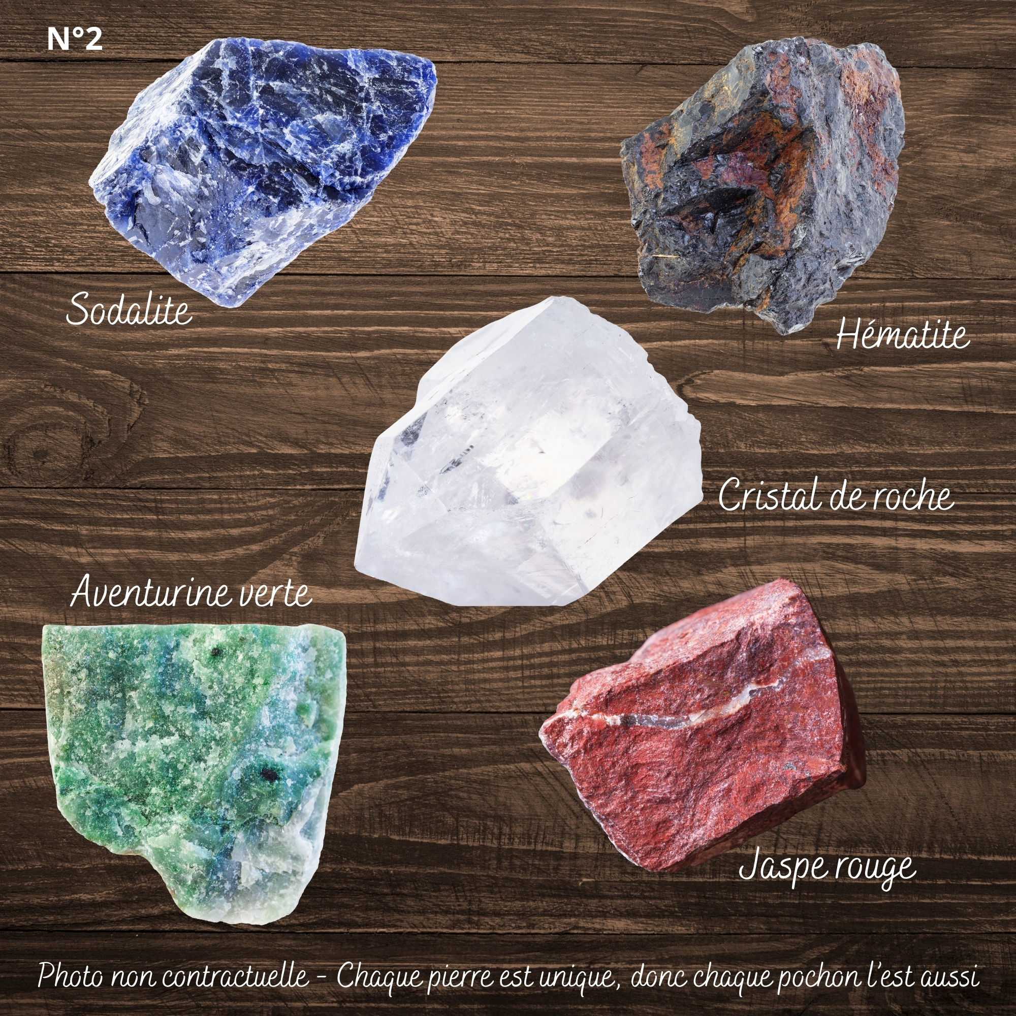 ⚪ Pierres : Sodalite, Hématite, Cristal de roche, Aventurine verte, Jaspe rouge