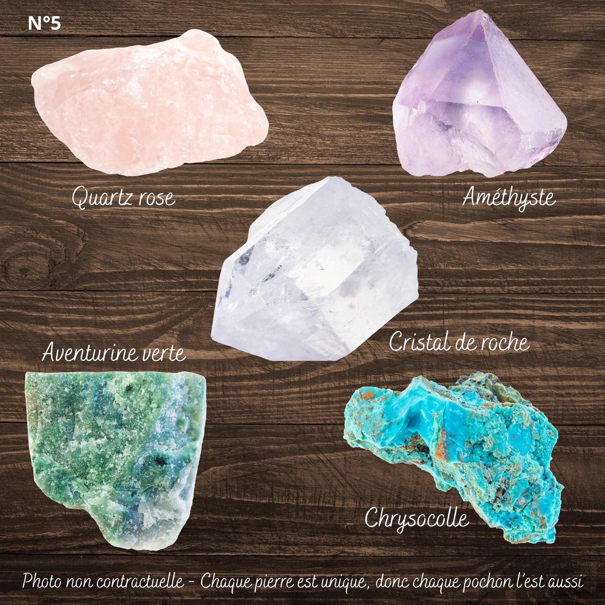 ⚪ Pierres : Quartz rose, Chrysocolle, Cristal de roche, Aventurine verte, Améthyste